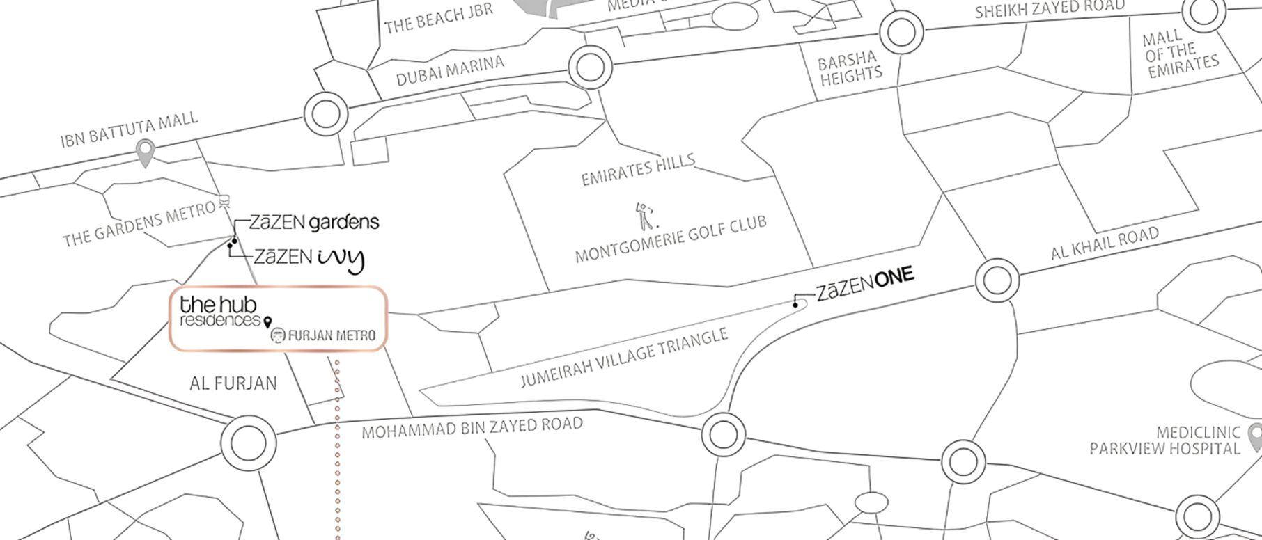 The Hub Residences by ZāZEN is an upscale residential development in Al Furjan. Just a one-minute walk from the Al Furjan Metro Station, it offers seamless access across Dubai.